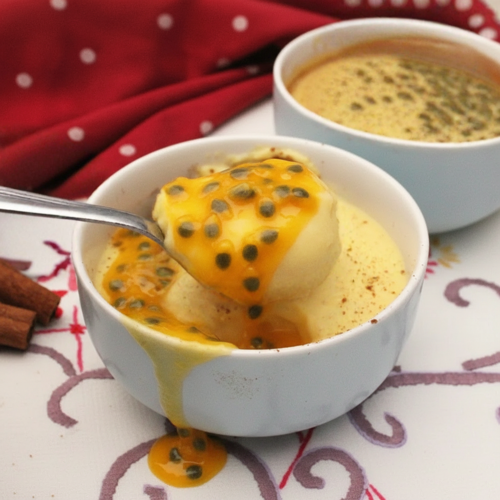 Una natilla ultrasuave y cremosa, elaborada con leche entera y crema de leche, aireada gracias a la clara batida y redondeada al final con la yema. El maracuyá por encima aporta el contraste ácido y refrescante perfecto.